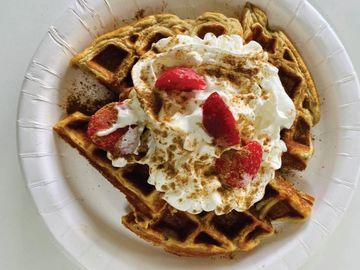 A protein waffle containing a good source of fiber, 21 vitamins and minerals. Excellent source of antioxidant Vitamin C and E. served with the toppings of your choice.